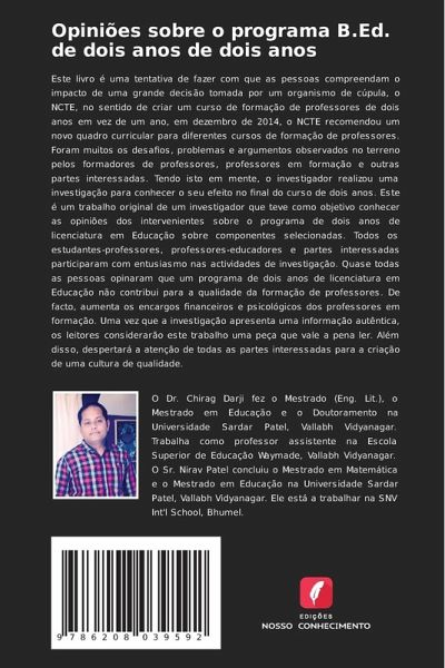 Este livro é uma tentativa de fazer com que as pessoas compreendam o impacto de uma grande decisão tomada por um organismo de cúpula, o NCTE, no sentido de criar um curso de formação de professores de dois anos em vez de um ano, em dezembro de 2014, o NCTE recomendou um novo quadro curricular para diferentes cursos de formação de professores. Foram muitos os desafios, problemas e argumentos observados no terreno pelos formadores de professores, professores em formação e outras partes interessadas. Tendo isto em mente, o investigador realizou uma investigação para conhecer o seu efeito no final do curso de dois anos. Este é um trabalho original de um investigador que teve como objetivo conhecer as opiniões dos intervenientes sobre o programa de dois anos de licenciatura em Educação sobre componentes selecionadas. Todos os estudantes-professores, professores-educadores e partes interessadas participaram com entusiasmo nas actividades de investigação. Quase todas as pessoas opinaram que um programa de dois anos de licenciatura em Educação não contribui para a qualidade da formação de professores. De facto, aumenta os encargos financeiros e psicológicos dos professores em formação. Uma vez que a investigação apresenta uma informação autêntica, os leitores considerarão este trabalho uma peça que vale a pena ler. Além disso, despertará a atenção de todas as partes interessadas para a criação de uma cultura de qualidade.