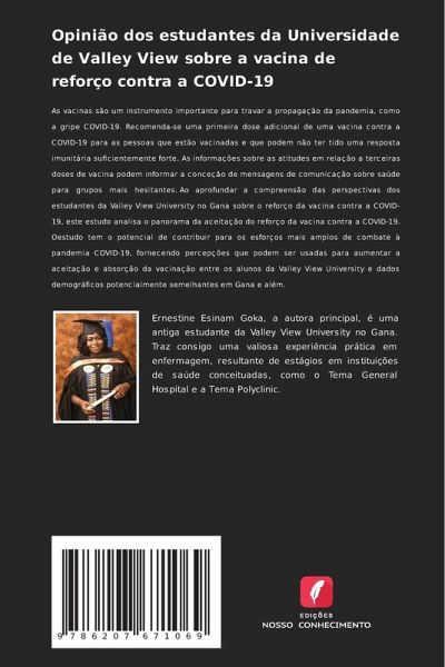 As vacinas são um instrumento importante para travar a propagação da pandemia, como a gripe COVID-19. Recomenda-se uma primeira dose adicional de uma vacina contra a COVID-19 para as pessoas que estão vacinadas e que podem não ter tido uma resposta imunitária suficientemente forte. As informações sobre as atitudes em relação a terceiras doses de vacina podem informar a conceção de mensagens de comunicação sobre saúde para grupos mais hesitantes. Ao aprofundar a compreensão das perspectivas dos estudantes da Valley View University no Gana sobre o reforço da vacina contra a COVID-19, este estudo analisa o panorama da aceitação do reforço da vacina contra a COVID-19. Oestudo tem o potencial de contribuir para os esforços mais amplos de combate à pandemia COVID-19, fornecendo percepções que podem ser usadas para aumentar a aceitação e absorção da vacinação entre os alunos da Valley View University e dados demográficos potencialmente semelhantes em Gana e além.