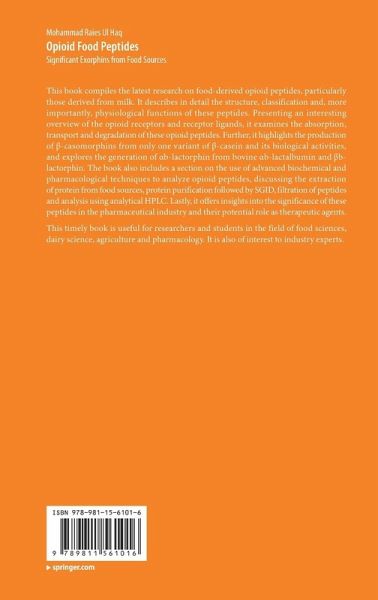 This book compiles the latest research on food-derived opioid peptides, particularly those derived from milk. It describes in detail the structure, classification and, more importantly, physiological functions of these peptides. Presenting an interesting overview of the opioid receptors and receptor ligands, it examines the absorption, transport and degradation of these opioid peptides. Further, it highlights the production of beta-casomorphins from only one variant of beta-casein and its biological activities, and explores the generation of b-lactorphin from bovine b-lactalbumin and betab-lactorphin. The book also includes a section on the use of advanced biochemical and pharmacological techniques to analyze opioid peptides, discussing the extraction of protein from food sources, protein purification followed by SGID, filtration of peptides and analysis using analytical HPLC. Lastly, it offers insights into the significance of these peptides in the pharmaceutical industry and their potential role as therapeutic agents.This timely book is useful for researchers and students in the field of food sciences, dairy science, agriculture and pharmacology. It is also of interest to industry experts.