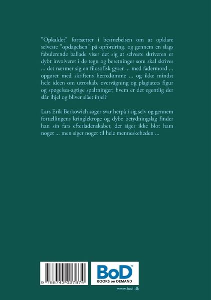"Opkaldet" fortsætter i bestræbelsen om at opklare selveste "opdagelsen" på opfordring, og gennem en slags fabulerende ballade viser det sig at selveste skriveren er dybt involveret i de tegn og beretninger som skal skrives ... det nærmer sig en filosofisk gyser ... med fadermord ... opgøret med skriftens herredømme ... og ikke mindst hele ideen om utroskab, overvågning og plagiatets figur og spøgelses-agtige spaltninger; hvem er det egentlig der slår ihjel og bliver slået ihjel? Lars Erik Berkowich søger svar herpå i sig selv og gennem fortællingens kringlekroge og dybe betydningslag finder han sin fars efterladenskaber, der sig ikke blot ham noget ... men noget til hele menneskeheden ...