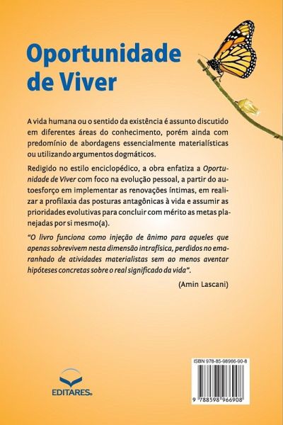 Oportunidade de Viver: Estudo sobre a existência humana e o sentido da vida. A vida humana ou o sentido da existência é assunto discutido em diferentes áreas do conhecimento, porém ainda com predomínio de abordagens essencialmente materialísticas ou utilizando argumentos dogmáticos. Redigido no estilo enciclopédico, a obra enfatiza a Oportunidade de Viver com foco na evolução pessoal, a partir do autoesforço em implementar as renovações íntimas, em realizar a profilaxia das posturas antagônicas à vida e assumir as prioridades evolutivas para concluir com mérito as metas planejadas por sim mesmo (a).