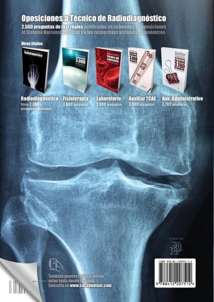 Material de autoevaluación para la preparación de las pruebas de acceso a la categoría de Técnico/a Especialista en Radiodiagnóstico / Diagnóstico por la imagen. Son 2.500 preguntas de tipo test de exámenes reales de los diferentes sistemas de salud. El ejemplar lleva además asociada una suscripción a la plataforma virtual www.cacahuetest.com, para poder repasarlas también desde el móvil, así como un anexo de otras 1.400 preguntas sobre Seguridad Radiológica.