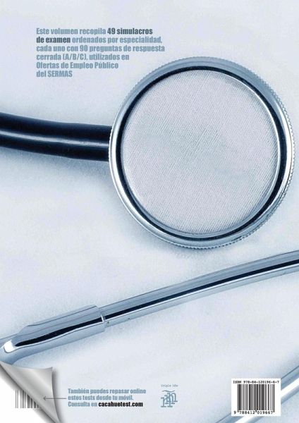 4.400 preguntas de examen tipo test ordenadas por especialidad. Recopilación de 49 simulacros de examen ordenados por especialidades, con preguntas de respuesta cerrada (A/B/C), utilizados en Ofertas de Empleo Público del Servicio Madrileño de Salud. 214 páginas tamaño DinA-4. Incluye acceso a plataforma online para responderlas también desde el móvil. Colección Sanitest. Especialidades incluidas: Medicina Interna Neumología Aparato digestivo Cirugía General y del Aparato Digestivo Endocrinología y Nutrición Nefrología Urología Oncología Médica Cardiología Cirugía Vascular y Angiología Cirugía Cardiovascular Medicina Intensiva Anestesiología y Reanimación Neurología Neurocirugía Neurofisiología Cirugía Ortopédica y Traumatología Medicina Física y Rehabilitación Cirugía reparadora, Plástica y Estética Pediatría (sin área) Pediatría (Cardiología) Pediatría (Digestivo) Pediatría (Infecciosas) Pediatría (Medicina Intensiva) Pediatría (Neonatología) Pediatría (Neurología) Pediatría (Oncohematología) Cirugia Pediatrica Obstetricia y Ginecología Dermatología Oftalmología Otorrinolaringología Hematología y Hemoterapia Microbiología clínica y Parasitología Bioquímica Clínica Inmunología Reumatología Anatomía Patológica Radiodiagnóstico Radiofísica Hospitalaria Medicina Nuclear Oncología Radioterápica Psiquiatría Psiquiatría Infantil Psicología Clínica Medicina del Trabajo Medicina Familiar y Comunitaria Medicina Preventiva y Salud Pública Geriatría