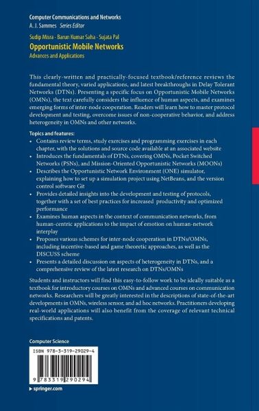 This textbook reviews the theory, applications, and latest breakthroughsin Delay Tolerant Networks (DTNs). Presenting a specific focus on OpportunisticMobile Networks (OMNs), the text considers the influence of human aspects, andexamines emerging forms of inter-node cooperation. Features: containsreview terms and exercises in each chapter, with the solutions and source codeavailable at an associated website; introduces the fundamentals of DTNs, covering OMNs, PSNs,and MOONs; describes the ONE simulator, explaining how to set up a simulationproject; provides detailed insights into the development and testing ofprotocols, together with a set of best practices for increased productivity andoptimized performance; examines human aspects in the context of communicationnetworks, from human-centric applications to the impact of emotion onhuman-network interplay; proposes various schemes for inter-node cooperation inDTNs/OMNs; presents a detailed discussion on aspects of heterogeneity inDTNs.