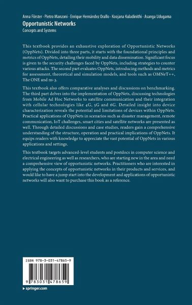 This textbook also offers comparative analyses and discussions on benchmarking. The third part delves into the implementation of OppNets, discussing technologies from Mobile Ad Hoc Networks to satellite communication and their integration with cellular technologies like 4G, 5G and 6G. Detailed insight into device characterization reveals the potential and limitations of devices within OppNets. Practical applications of OppNets in scenarios such as disaster management, remotecommunication, IoT challenges, smart cities and satellite networks are presented as well. Through detailed discussions and case studies, readers gain a comprehensive understanding of the structure, operation and practical implications of OppNets. It equips readers with knowledge to appreciate the vast potential of OppNets in various applications and settings.