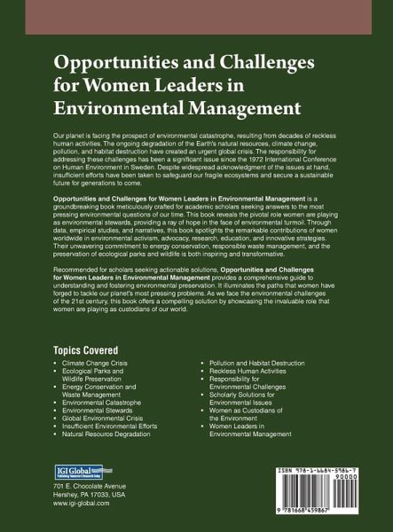 Our planet is facing the prospect of environmental catastrophe, resulting from decades of reckless human activities. The ongoing degradation of the Earth's natural resources, climate change, pollution, and habitat destruction have created an urgent global crisis. The responsibility for addressing these challenges has been a significant issue since the 1972 International Conference on Human Environment in Sweden. Despite widespread acknowledgment of the issues at hand, insufficient efforts have been taken to safeguard our fragile ecosystems and secure a sustainable future for generations to come. Opportunities and Challenges for Women Leaders in Environmental Management is a groundbreaking book meticulously crafted for academic scholars seeking answers to the most pressing environmental questions of our time. This book reveals the pivotal role women are playing as environmental stewards, providing a ray of hope in the face of environmental turmoil. Through data, empirical studies, and narratives, this book spotlights the remarkable contributions of women worldwide in environmental activism, advocacy, research, education, and innovative strategies. Their unwavering commitment to energy conservation, responsible waste management, and the preservation of ecological parks and wildlife is both inspiring and transformative.