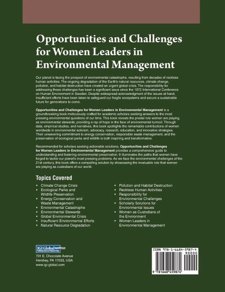 Our planet is facing the prospect of environmental catastrophe, resulting from decades of reckless human activities. The ongoing degradation of the Earth's natural resources, climate change, pollution, and habitat destruction have created an urgent global crisis. The responsibility for addressing these challenges has been a significant issue since the 1972 International Conference on Human Environment in Sweden. Despite widespread acknowledgment of the issues at hand, insufficient efforts have been taken to safeguard our fragile ecosystems and secure a sustainable future for generations to come. Opportunities and Challenges for Women Leaders in Environmental Management is a groundbreaking book meticulously crafted for academic scholars seeking answers to the most pressing environmental questions of our time. This book reveals the pivotal role women are playing as environmental stewards, providing a ray of hope in the face of environmental turmoil. Through data, empirical studies, and narratives, this book spotlights the remarkable contributions of women worldwide in environmental activism, advocacy, research, education, and innovative strategies. Their unwavering commitment to energy conservation, responsible waste management, and the preservation of ecological parks and wildlife is both inspiring and transformative.