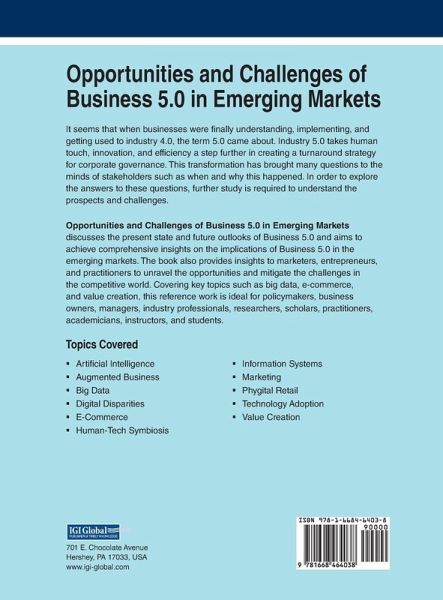 It seems that when businesses were finally understanding, implementing, and getting used to industry 4.0, the term 5.0 came about. Industry 5.0 takes human touch, innovation, and efficiency a step further in creating a turnaround strategy for corporate governance. This transformation has brought many questions to the minds of stakeholders such as when and why this happened. In order to explore the answers to these questions, further study is required to understand the prospects and challenges. Opportunities and Challenges of Business 5.0 in Emerging Markets discusses the present state and future outlooks of Business 5.0 and aims to achieve comprehensive insights on the implications of Business 5.0 in the emerging markets. The book also provides insights to marketers, entrepreneurs, and practitioners to unravel the opportunities and mitigate the challenges in the competitive world. Covering key topics such as big data, e-commerce, and value creation, this reference work is ideal for policymakers, business owners, managers, industry professionals, researchers, scholars, practitioners, academicians, instructors, and students.