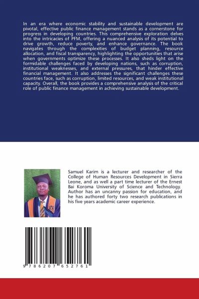 In an era where economic stability and sustainable development are pivotal, effective public finance management stands as a cornerstone for progress in developing countries. This comprehensive exploration delves into the intricacies of PFM, offering a nuanced analysis of its potential to drive growth, reduce poverty, and enhance governance. The book navigates through the complexities of budget planning, resource allocation, and fiscal transparency, highlighting the opportunities that arise when governments optimize these processes. It also sheds light on the formidable challenges faced by developing nations, such as corruption, institutional weaknesses, and external pressures, that hinder effective financial management. It also addresses the significant challenges these countries face, such as corruption, limited resources, and weak institutional capacity. Overall, the book provides a comprehensive analysis of the critical role of public finance management in achieving sustainable development.