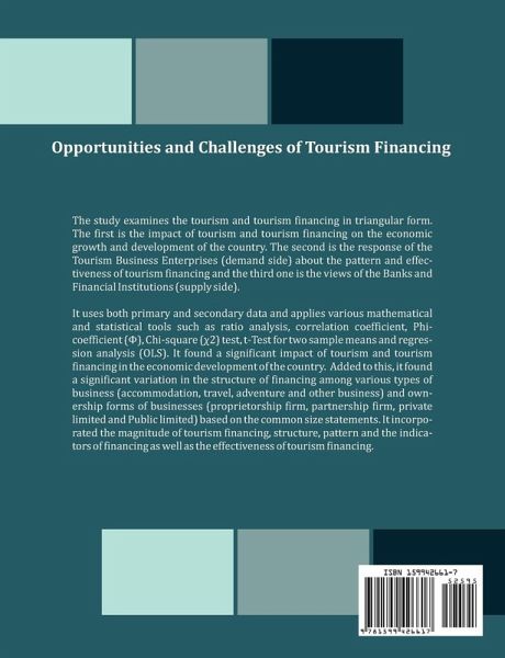 The study examines the tourism and tourism financing in triangular form. The first is the impact of tourism and tourism financing on the economic growth and development of the country. The second is the response of the Tourism Business Enterprises (demand side) about the pattern and effectiveness of tourism financing and the third one is the views of the Banks and Financial Institutions (supply side). It uses both primary and secondary data and applies various mathematical and statistical tools such as ratio analysis, correlation coefficient, Phi-coefficient, Chi-square test, t-Test for two sample means and regression analysis (OLS). It found a significant impact of tourism and tourism financing in the economic development of the country. Added to this, it found a significant variation in the structure of financing among various types of business (accommodation, travel, adventure and other business) and ownership forms of businesses (proprietorship firm, partnership firm, private limited and Public limited) based on the common size statements. It incorporated the magnitude of tourism financing, structure, pattern and the indicators of financing as well as the effectiveness of tourism financing.