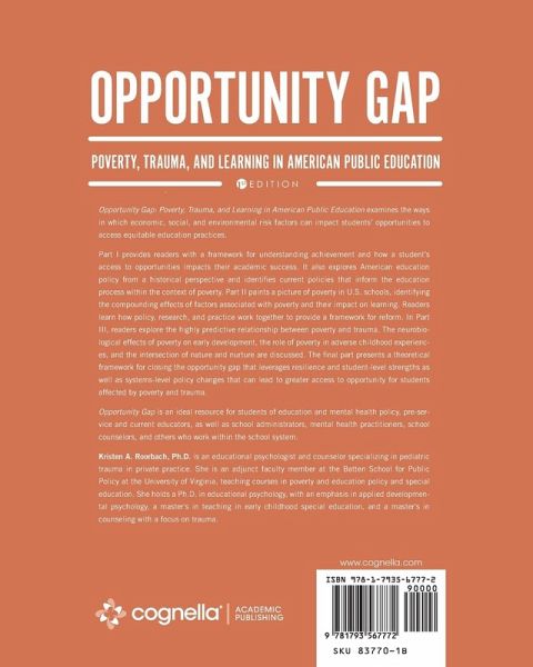 Opportunity Gap: Poverty, Trauma, and Learning in American Public Education examines the ways in which economic, social, and environmental risk factors can impact students' opportunities to access equitable education practices. Part I provides readers with a framework for understanding achievement and how a student's access to opportunities impacts their academic success. It also explores American education policy from a historical perspective and identifies current policies that inform the education process within the context of poverty. Part II paints a picture of poverty in U.S. schools, identifying the compounding effects of factors associated with poverty and their impact on learning. Readers learn how policy, research, and practice work together to provide a framework for reform. In Part III, readers explore the highly predictive relationship between poverty and trauma. The neurobiological effects of poverty on early development, the role of poverty in adverse childhood experiences, and the intersection of nature and nurture are discussed. The final part presents a theoretical framework for closing the opportunity gap that leverages resilience and student-level strengths as well as systems-level policy changes that can lead to greater access to opportunity for students affected by poverty and trauma. Opportunity Gap is an ideal resource for students of education and mental health policy, pre-service and current educators, as well as school administrators, mental health practitioners, school counselors, and others who work within the school system.