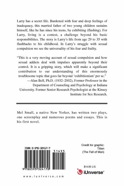 Larry has a secret life. Burdened with fear and deep feelings of inadequacy, this married father of two young children sustains himself, like he has since his teens, by exhibiting (flashing). For Larry, living is a contest, a challenge beyond his basic responsibilities. The story is Larry's life from age 29 to 35 with flashbacks to his childhood. In Larry's struggle with sexual compulsion we see the universality of his fear and frailty. "This is a very moving account of sexual compulsion and how sexual addicts deal with impulses apparently beyond their control. It is a gripping story, which will make a significant contribution to our understanding of this enormously troublesome topic that goes far beyond '"exhibitionism" per se." --Alan Bell, Ph.D. (1932-2002), Former Professor in the Department of Counseling and Psychology at Indiana University. Former Senior Research Psychologist at the Kinsey Institute for Sex Research.