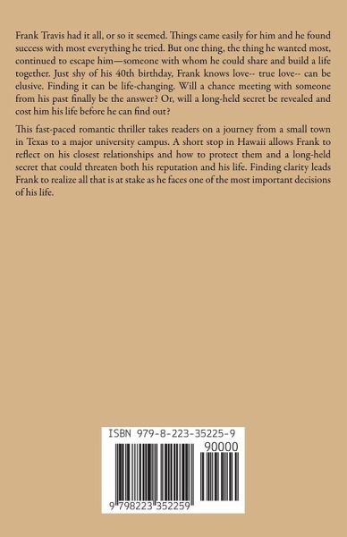 Frank Travis had it all, or so it seemed. Things came easily for him and he found success with most everything he tried. But one thing, the thing he wanted most, continued to escape him-someone with whom he could share and build a life together. Just shy of his 40th birthday, Frank knows love-- true love-- can be elusive. Finding it can be life-changing. Will a chance meeting with someone from his past finally be the answer? Or, will a long-held secret be revealed and cost him his life before he can find out? This fast-paced romantic thriller takes readers on a journey from a small town in Texas to a major university campus. A short stop in Hawaii allows Frank to reflect on his closest relationships and how to protect them and a long-held secret that could threaten both his reputation and his life. Finding clarity leads Frank to realize all that is at stake as he faces one of the most important decisions of his life.