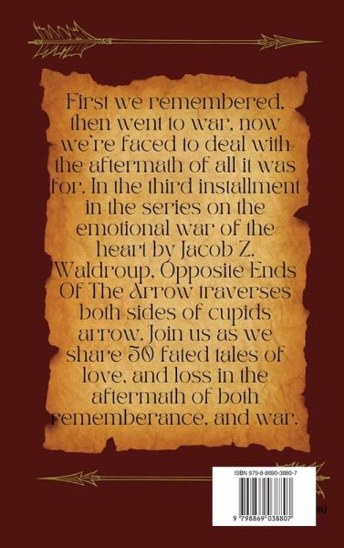 First we remembered, then went to war, now we're faced to deal with the aftermath of all it was for. In this third installment of the series on the emotional war of the heart by Jacob Z. Waldroup. Opposite ends of the arrow traverses both sides of cupids arrow, with tales of both love and loss as we deal with the aftermath of dealing with the heart, in many forms.