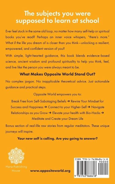 The subjects you were supposed to learn at school Ever feel stuck in the same old loop, no matter how many self-help or spiritual books you've read? Perhaps an inner voice whispers, "there's more." What if the life you dream of is closer than you think-unlocking a resilient, empowered, and confident version of you? With simple, light-hearted guidance, this book blends evidence-based science, ancient wisdom and profound spirituality to help you think, feel, and live like the person you were always meant to be. What Makes Opposite World Stand Out? No complex jargon. No inapplicable theoretical advice. Just actionable advice and practical steps. Opposite World empowers you to: Break Free from Self-Sabotaging Beliefs ~ Rewire Your Mindset for Success and Happiness ~ Connect to your Higher-Self ~ Navigate Relationships as you Grow ~ Elevate your health with Bio-Hacks ~ Meditate and Create your Dream Life Bonus section of real-life raw stories from eight regular meditators. These unique journeys will inspire. Your new self is calling. Are you going to answer?