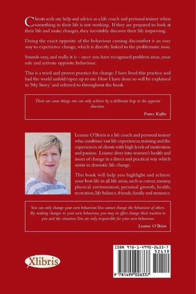 A truthful account of life. A process of self development and discovery. It is not only about changing - it is about doing the complete opposite.Clients seek my help and advice as a life coach and personal trainer when something in their life is not working. If they are prepared to look at their life and make changes, they inevitably discover their life improving. Doing the exact opposite of the behaviour causing discomfort is an easy way to experience change, which is directly linked to the problematic issue.Sounds easy, and really it is - once you have recognised problem areas, your role and activate opposite behaviour. This is a tried and proven practice for change. I have lived this practice and had the world unfold/open up to me. How I have done so will be explained in ' My Story' and referred to throughout the book. There are some things one can only achieve by a deliberate leap in the opposite direction. Franz Kafka