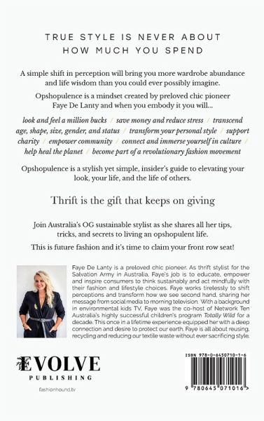 True style is never about how much you spend A simple shift in perception will bring you more wardrobe abundance and life wisdom that you could ever possibly imagine. Opshopulence is a mindset created by preloved chic pioneer Faye De Lanty and when you embody it you'll: -- look and feel a million bucks -- save money and reduce style stress -- transcend age, shape, size, gender and status -- transform your personal style and life -- support charity -- empower and connect to community -- help heal the planet -- become part of a revolutionary style movement All while looking incredibly high end chic without having to spend a fortune, and it won't cost the earth. Thrift is the gift that keeps on giving... Join Australia's OG eco stylist and she shares all her tips, tricks and style secrets to live an Opshopulent life. This is future fashion and it's time to claim your front row seat! About the author, Faye De Lanty Faye De Lanty is a preloved chic pioneer. As eco stylist for The Salvation Army in Australia, it's Faye's job to educate, empower and inspire consumers to think sustainability and act mindfully with their fashion and lifestyle choices. Faye works tirelessly to shift perceptions and transform how we see second hand. From visual merchandising, social media strategy, eco events and branding concepts to presenting regular fashion segments on National Morning TV with the Today Show Faye is all about reusing, recycling and reducing our textile waste without ever sacrificing style.