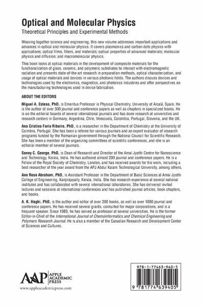 PART I: PLASMONICS AND CARBON DOTS PHYSICS WITH APPLICATIONS 1. Plasmonic Sensing by Green Synthesized Silver Nanoparticles 2. Surface Plasmon Response and Applications of Silver Nanoparticles Synthesized via Sol-Gel Route 3. Localized Surface Plasmon Resonance (LSPR) Applications of Gold (Au) and Silver (Ag) Nanoparticles 4. Green Carbon Dots as Optical Sensors for Metal Ions 5. Fluorescent Carbon Quantum Dots: Properties and Applications PART II: OPTICAL FILMS, FIBERS, AND MATERIALS 6. Latest Deposition Techniques for Optical Thin Films and Coatings 7. Applications of Polymer Optical Fibers 8. Rare Earth Oxalates: A Promising Optical Material without Luminescence Quenching PART III: OPTICAL PROPERTIES OF ADVANCED MATERIALS 9. The Optical Properties and Versatile Biomedical Applications of Semiconductor Nanoparticles: Imaging, Sensing, and Photothermal Therapy 10. Optical Properties of Pr3+ Doped Polyvinylidene Fluoride-Titanium Dioxide (PVDF-TiO2) Hybrid 11. Synthesis and Optical Properties of Green Carbon Dots 12. Nonlinear Optical Properties of Inorganic Polymers 13. Nonlinear Optical Properties of Metal Nanoparticles and Their Composites Synthesized by Different Methods 14. Phosphors: A Promising Optical Material for Multifunctional Applications PART IV: MOLECULAR PHYSICS AND DIFFUSION 15. Theoretical Values of Diffusion Coefficients of Electrolytes in Aqueous Solutions: Important Parameters with Application in Fundamental and Technological Areas 16. Thermodiffusion on the Fontainebleau Benchmark Mixture: An Overview 17. Hydrodynamic Radii for Sodium Salts in Aqueous Solutions: Contribution from Electrical Conductance and Diffusion PART V: MACROMOLECULAR PHYSICS 18. Pesticides and Their Environment and Health Impact: An Approach to Remediation Using Hydrogels 19. A New Equation for the Computation of the Lattice Energies of Inorganic Ionic Crystals Based on Parr's Electrophilicity Index
