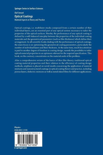 Optical coatings, i.e. multilayer stacks composed from a certain number of thin individual layers, are an essential part of any optical system necessary to tailor the properties of the optical surfaces. Hereby, the performance of any optical coating is defined by a well-balanced interplay between the properties of the individual coating materials and the geometrical parameters (such as film thickness) which define their arrangement. In all scientific books dealing with the performance of optical coatings, the main focus is on optimizing the geometrical coating parameters, particularly the number of individual layers and their thickness. At the same time, much less attention is paid to another degree of freedom in coating design, namely the possibility to tailor optical material properties to an optimum relevant for the required specification. This book, on the contrary, concentrates on the material aside of the problem. After a comprehensive review of the basics of thin film theory, traditional optical coating material properties and their relation to the efficiency of coating design methods, emphasis is placed on novel results concerning the application of material mixtures and nanostructured coatings in optical coating theory and practice, including porous layers, dielectric mixtures as well as metal island films for different applications.