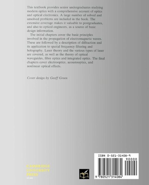 This textbook provides senior undergraduates studying modern optics with a comprehensive account of optics and optical electronics. A large number of solved and unsolved problems are included in the book. The extensive coverage makes it valuable to postgraduates, and also to optical engineers, as a source of basic design information. The initial chapters cover the basic principles involved in the propagation of electromagnetic waves. These are followed by a description of diffraction and its application to spatial frequency filtering and holography. Laser theory and the various types of laser are covered, as well as the theory of optical waveguides, fibre optics and integrated optics. The final chapters cover electrooptics, acoustooptics, and nonlinear optical effects.