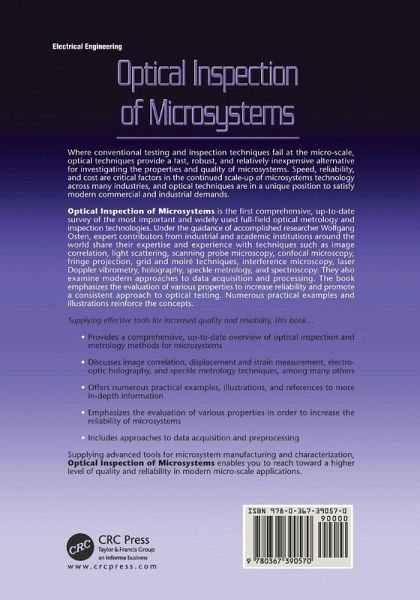 Where conventional testing and inspection techniques fail at the micro-scale, optical techniques provide a fast, robust, and relatively inexpensive alternative for investigating the properties and quality of microsystems. Speed, reliability, and cost are critical factors in the continued scale-up of microsystems technology across many industries, and optical techniques are in a unique position to satisfy modern commercial and industrial demands. Optical Inspection of Microsystems is the first comprehensive, up-to-date survey of the most important and widely used full-field optical metrology and inspection technologies. Under the guidance of accomplished researcher Wolfgang Osten, expert contributors from industrial and academic institutions around the world share their expertise and experience with techniques such as image correlation, light scattering, scanning probe microscopy, confocal microscopy, fringe projection, grid and moiré techniques, interference microscopy, laser Doppler vibrometry, holography, speckle metrology, and spectroscopy. They also examine modern approaches to data acquisition and processing. The book emphasizes the evaluation of various properties to increase reliability and promote a consistent approach to optical testing. Numerous practical examples and illustrations reinforce the concepts. Supplying advanced tools for microsystem manufacturing and characterization, Optical Inspection of Microsystems enables you to reach toward a higher level of quality and reliability in modern micro-scale applications.