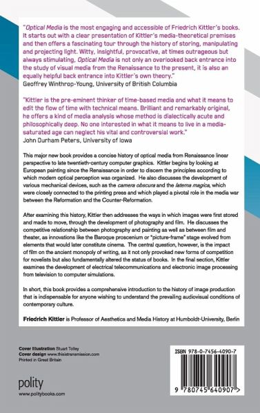 This major new book provides a concise history of optical media from Renaissance linear perspective to late twentieth-century computer graphics. Kittler begins by looking at European painting since the Renaissance in order to discern the principles according to which modern optical perception was organized. He also discusses the development of various mechanical devices, such as the camera obscura and the laterna magica, which were closely connected to the printing press and which played a pivotal role in the media war between the Reformation and the Counter-Reformation.