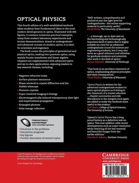 This fourth edition of a well-established textbook is ideal for undergraduate and advanced courses on modern optics. Numerous practical examples are given, many from student laboratory experiments and lecture demonstrations. Illustrated with 400 figures, text is supplemented by advanced topics and up-to-date applications. Additional resources are available at www.cambridge.org/lipson.