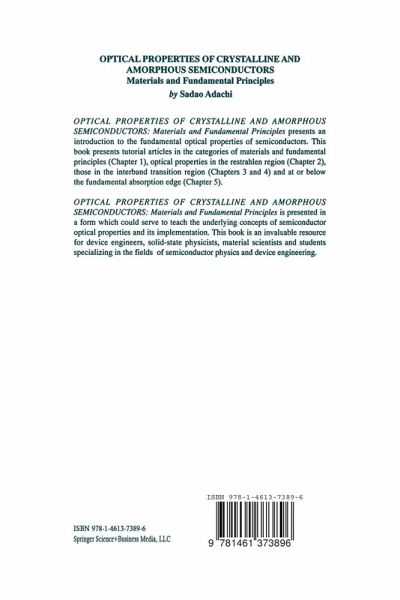 Optical Properties of Crystalline and Amorphous Semiconductors: Materials and Fundamental Principles is presented in a form which could serve to teach the underlying concepts of semiconductor optical properties and their implementation. This book is an invaluable resource for device engineers, solid-state physicists, material scientists and students specializing in the fields of semiconductor physics and device engineering.