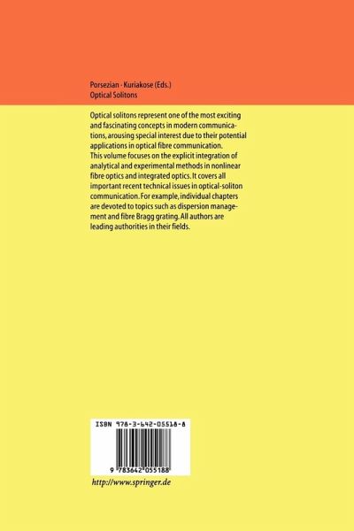 Optical Solitons represent one of the most exciting and fascinating concepts in modern communications, arousing special interest due to their potential applications in optical fibre communication. This volume focuses on the explicit integration of analytical and experimental methods in nonlinear fibre optics and integrated optics. It covers all important recent technical issues in optical-soliton communication. For example, individual chapters are devoted to topics such as dispersion management and fibre Bragg grating. All authors are leading authorities in their fields.