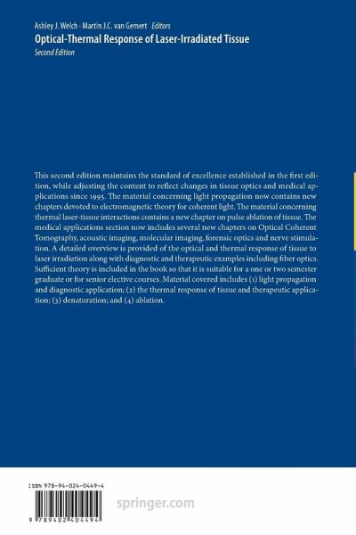 The second edition maintains the standard of excellence established in the first edition, while adjusting the content to reflect changes in tissue optics and medical applications since 1995.The material concerning light propagation now contains new chapters devoted to electromagnetic theory for coherent light. The material concerning thermal laser-tissue interactions contains a new chapter on pulse ablation of tissue. The medical applications section now includes several new chapters on Optical Coherent Tomography, acoustic imaging, molecular imaging, forensic optics and nerve stimulation. A detailed overview is provided of the optical and thermal response of tissue to laser irradiation along with diagnostic and therapeutic examples including fiber optics. Sufficient theory is included in the book so that it is suitable for a one or two semester graduate or for senior elective courses. Material covered includes (1) light propagation and diagnostic application; (2) the thermalresponse of tissue and therapeutic application; (3) denaturation; and (4) ablation.The theory and applications provide researchers with sufficient detail that this volume will become the primary reference for laser-tissue interactions and medical applications.