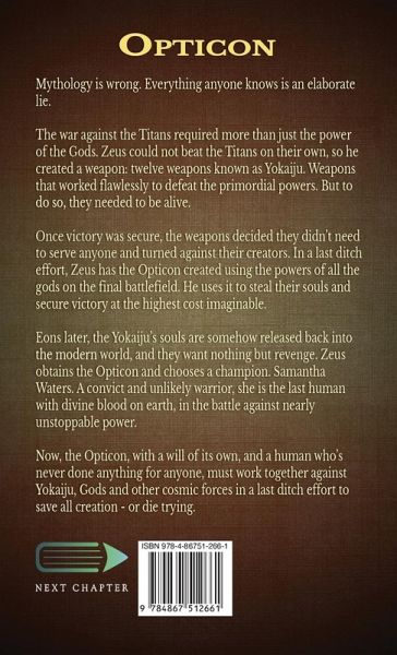 Mythology is wrong. Everything anyone knows is an elaborate lie. The war against the Titans required more than just the power of the Gods. Zeus could not beat the Titans on their own, so he created a weapon: twelve weapons known as Yokaiju. Weapons that worked flawlessly to defeat the primordial powers. But to do so, they needed to be alive. Once victory was secure, the weapons decided they didn't need to serve anyone and turned against their creators. In a last ditch effort, Zeus has the Opticon created using the powers of all the gods on the final battlefield. He uses it to steal their souls and secure victory at the highest cost imaginable. Eons later, the Yokaiju's souls are somehow released back into the modern world, and they want nothing but revenge. Zeus obtains the Opticon and chooses a champion. Samantha Waters. A convict and unlikely warrior, she is the last human with divine blood on earth, in the battle against nearly unstoppable power. Now, the Opticon, with a will of its own, and a human who's never done anything for anyone, must work together against Yokaiju, Gods and other cosmic forces in a last ditch effort to save all creation - or die trying.