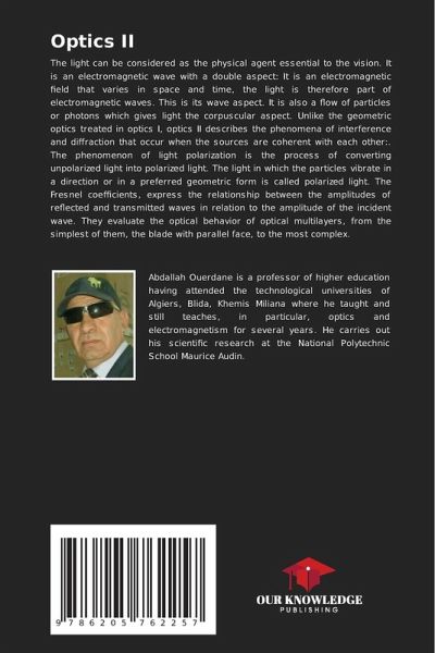 The light can be considered as the physical agent essential to the vision. It is an electromagnetic wave with a double aspect: It is an electromagnetic field that varies in space and time, the light is therefore part of electromagnetic waves. This is its wave aspect. It is also a flow of particles or photons which gives light the corpuscular aspect. Unlike the geometric optics treated in optics I, optics II describes the phenomena of interference and diffraction that occur when the sources are coherent with each other:. The phenomenon of light polarization is the process of converting unpolarized light into polarized light. The light in which the particles vibrate in a direction or in a preferred geometric form is called polarized light. The Fresnel coefficients, express the relationship between the amplitudes of reflected and transmitted waves in relation to the amplitude of the incident wave. They evaluate the optical behavior of optical multilayers, from the simplest of them, the blade with parallel face, to the most complex.