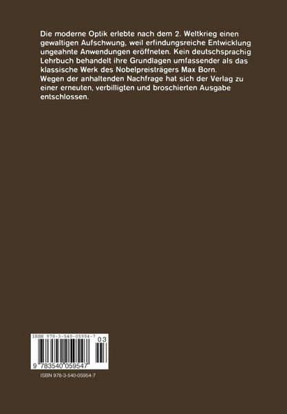 Historische Übersicht.- Erstes Kapitel. Elektromagnetische Lichttheorie für durchsichtige isotrope Körper ohne Farbenzerstreuung.- § 1. Die Maxwellschen Gleichungen.- § 2. Der Energiesatz.- § 3. Fortpflanzung ebener Wellen.- § 4. Das Snelliussche Brechungsgesetz.- § 5. Die Maxwellsche Formel für den Brechungsindex.- § 6. Die skalare einfach harmonische Welle.- § 7. Die einfach harmonische Vektorwelle. Elliptische Polarisation.- § 8. Lineare und zirkulare Polarisation.- § 9. Die Grenzbedingungen an der Berührungsfläche zweier Medien.- § 10. Die Fresnelschen Formeln für Reflexion und Brechung einer ebenen Welle.- § 11. Polarisation bei Spiegelung und Brechung.- * § 12. Einfluß von Übergangsschichten auf die Polarisation des reflektierten Lichts.- § 13. Totalreflexion.- Zweites Kapitel. Geometrische Optik.- § 14. Grenzübergang zu unendlich kleiner Wellenlänge.- § 15. Der Satz von Malus und das Prinzip von Fermat.- § 16. Die Brennpunktseigenschaften eines infinitesimalen Strahlenbüschels.- § 17. Kaustische Flächen und Kurven.- § 18. Brechung an einer Kugelfläche.- * § 19. Absolute optische Instrumente.- § 20. Achsensymmetrische Kollineationen.- § 21. Charakteristische Funktion und Eikonal.- § 22. Das Winkeleikonal.- § 23. Das Winkeleikonal für die Brechung an einer Rotationsfläche.- § 24. Die Gausssche Dioptrik.- § 25. Die Strahlenbegrenzung durch Blenden.- § 26. Die Farbenabweichungen.- § 27. Das Seidelsche Eikonal.- § 28. Die Sinusbedingung.- * § 29. Die Fehler dritter Ordnung.- * § 30. Das Seidelsche Eikonal eines zusammengesetzten optischen Systems.- * § 31. Die Fehler dritter Ordnung eines zentrierten Linsensystems.- * § 32. Beispiel. Die dünne Einzellinse.- § 33. Optische Abbildungsinstrumente.- Drittes Kapitel.Interferenz.- § 34. Interferenz zweier Strahlen.- § 35. Der Interferenzversuch nach Young.- § 36. Der Fresnelsche Doppelspiegel, das Fresnelsche Biprisma, die Halblinsen von Billet.- § 37. Stehende Wellen.- § 38. Die Farben dünner Blättchen und die Newtonschen Ringe.- § 39. Die Schärfe der Interferenzstreifen.- § 40. Interferenzrefraktometer.- § 41. Interferometer.- § 42. Interferenzspektroskope und ihr Auflösungsvermögen.- Viertes Kapitel. Beugung.- § 43. Wesen der Beugungserscheinungen. Kugelwellen.- § 44. Das Huygenssche Prinzip.- § 45. Kirchhoffs Formulierung des Huygensschen Prinzips.- § 46. Die Kirchhoffsche Beugungstheorie.- § 47. Klassifizierung der Beugungserscheinungen. Das Babinetsche Prinzip.- § 48. Fraunhofersche Beugungserscheinungen am Rechteck und am Spalt.- § 49. Die Beugungserscheinungen an einer kreisförmigen Öffnung.- § 50. Beugende Öffnungen von anderen Formen.- § 51. Beugungsgitter.- § 52. Ebene Kreuzgitter und Raumgitter. Röntgenspektren.- 1. Das Laueverfahren.- 2. Die Verfahren von Bragg und Debye-Scherrer-Hull.- § 53. Das Auflösungsvermögen optischer Instrumente.- a) Das Auflösungsvermögen des Gitters.- b) Das Auflösungsvermögen des Prismas.- c) Die Auflösungsgrenze des Fernrohrs.- d) Die Auflösungsgrenze des Mikroskops.- ?) Abbildung selbstleuchtender Objekte.- ?) Abbildung nicht selbstleuchtender Objekte.- § 54. Messung kleiner Winkel.- § 55. Fresnelsche Beugungserscheinungen.- * § 56. Verhalten der Lichtwellen in der Umgebung von Punkten geometrischer Strahlenvereinigung; Beugungstheorie der Bildfehler.- * § 57. Sommerfelds strenge Behandlung der Beugungserscheinungen.- Fünftes Kapitel. Kristalloptik.- § 58. Elektromagnetische Lichttheorie für anisotrope Körper.- § 59. Die Fresnelschen Formelnfür die Lichtausbreitung in Kristallen.- § 60. Geometrische Konstruktionen zur Bestimmung von Fortpflanzungsgeschwindigkeiten und Schwingungsrichtungen der Wellen.- § 61. Optische Kristallklassen. Optisch-isotrope und einachsige Kristalle.- § 62. Optisch zweiachsige Kristalle.- §63. Messung der optischen Kristalleigenschaften. Polarisator und Kompensator.- 1. Das Nicolsche Prisma.- 2. Kompensatoren.- a)