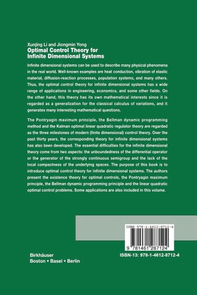 1. Control Problems in Infinite Dimensions.- 1. Diffusion Problems.- 2. Vibration Problems.- 3. Population Dynamics.- 4. Fluid Dynamics.- 5. Free Boundary Problems.- Remarks.- 2. Mathematical Preliminaries.- 1. Elements in Functional Analysis.- 1.1. Spaces.- 1.2. Linear operators.- 1.3. Linear functional and dual spaces.- 1.4. Adjoint operators.- 1.5. Spectral theory.- 1.6. Compact operators.- 2. Some Geometric Aspects of Banach Spaces.- 2.1. Convex sets.- 2.2. Convexity of Banach spaces.- 3. Banach Space Valued Functions.- 3.1. Measurability and integrability.- 3.2. Continuity and differentiability.- 4. Theory of Co Semigroups.- 4.1. Unbounded operators.- 4.2. Co semigroups.- 4.3. Special types of Co semigroups.- 4.4. Examples.- 5. Evolution Equations.- 5.1. Solutions.- 5.2. Semilinear equations.- 5.3. Variation of constants formula.- 6. Elliptic Partial Differential Equations.- 6.1. Sobolev spaces.- 6.2. Linear elliptic equations.- 6.3. Semilinear elliptic equations.- Remarks.- 3. Existence Theory of Optimal Controls.- 1. Souslin Space.- 1.1. Polish space.- 1.2. Souslin space.- 1.3. Capacity and capacitability.- 2. Multifunctions and Selection Theorems.- 2.1. Continuity.- 2.2. Measurability.- 2.3. Measurable selection theorems.- 3. Evolution Systems with Compact Semigroups.- 4. Existence of Feasible Pairs and Optimal Pairs.- 4.1. Cesari property.- 4.2. Existence theorems.- 5. Second Order Evolution Systems.- 5.1. Formulation of the problem.- 5.2. Existence of optimal controls.- 6. Elliptic Partial Differential Equations and Variational Inequalities.- Remarks.- 4. Necessary Conditions for Optimal Controls - Abstract Evolution Equations.- 1. Formulation of the Problem.- 2. Ekeland Variational Principle.- 3. Other Preliminary Results.- 3.1. Finite codimensionality.- 3.2. Preliminaries for spike perturbation.- 3.3. The distance function.- 4. Proof of the Maximum Principle.- 5. Applications.- Remarks.- 5. Necessary Conditions for Optimal Controls - Elliptic Partial Differential Equations.- 1. Semilinear Elliptic Equations.- 1.1. Optimal control problem and the maximum principle.- 1.2. The state coastraints.- 2. Variation along Feasible Pairs.- 3. Proof of the Maximum Principle.- 4. Variational Inequalities.- 4.1. Stability of the optimal cost.- 4.2. Approximate control problems.- 4.3. Maximum principle and its proof.- 5. Quasilinear Equations.- 5.1. The state equation and the optimal control problem.- 5.2. The maximum principle.- 6. Minimax Control Problem.- 6.1. Statement of the problem.- 6.2. Regularization of the cost functional.- 6.3. Necessary conditions for optimal controls.- 7. Bounary Control Problems.- 7.1. Formulation of the problem.- 7.2. Strong stability and the qualified maximum principle.- 7.3. Neumann problem with measure data.- 7.4. Exact penalization and a proof of the maximum principle.- Remarks.- 6. Dynamic Programming Method for Evolution Systems.- 1. Optimality Principle and Hamilton-Jacobi-Bellman Equations.- 2. Properties of the Value Functions.- 2.1. Continuity.- 2.2. B-continuity.- 2.3. Semi-concavity.- 3. Viscosity Solutions.- 4. Uniqueness of Viscosity Solutions.- 4.1. A perturbed optimization lemma.- 4.2. The Hilbert space X?.- 4.3. A uniqueness theorem.- 5. Relation to Maximum Principle and Optimal Synthesis.- 6. Infinite Horizon Problems.- Remarks.- 7. Controllability and Time Optimal Control.- 1. Definitions ofControllability.- 2. Controllability for linear systems.- 2.1. Approximate controllability.- 2.2. Exact controllability.- 3. Approximate controllability for semilinear systems.- 4. Time Optimal Control - Semilinear Systems.- 4.1. Necessary conditions for time optimal pairs.- 4.2. The minimum time function.- 5. Time Optimal Control - Linear Systems.- 5.1. Convexity of the reachable set.- 5.2. Encounter of moving sets.- 5.3. Time optimal control.- Remarks.- 8. Optimal Switching and Impulse Controls.- 1. Switching and Impulse Controls.- 2. Preliminary Results.- 3. Properties of the Value Function.- 4. Optimality Principle and the HJB Equation.- 5. Construction of an Optimal Control.- 6. Approximation of the Control Problem.- 7. Viscosity Solutions.- 8. Problem in Finite Horizon.- Remarks.- 9. Linear Quadratic Optimal Control Problems.- 1. Formulation of the Problem.- 1.1. Examples of unbounded control problems.- 1.2. The LQ problem.- 2. Well-posedness and Solvability.- 3. State Feedback Control.- 3.1. Two-point boundary value problem.- 3.2. The Problem (LQ)t.- 3.3. A Fredholm integral equation.- 3.4. State feedback representation of optimal controls.- 4. Riccati Integral Equation.- 5. Problem in Infinite Horizon.- 5.1. Reduction of the problem.- 5.2. Well-posedness and solvability.- 5.3. Algebraic Riccati equation.- 5.4. The positive real lemma.- 5.5. Feedback stabilization.- 5.6. Fredholm integral equation and Riccati integral equation.- Remarks.- References.