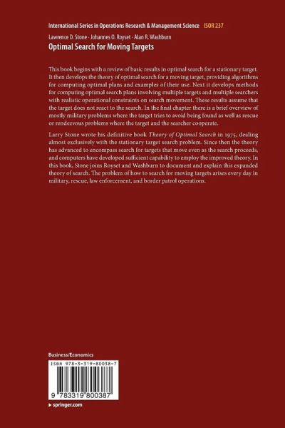 Larry Stone wrote his definitive book Theory of Optimal Search in 1975, dealing almost exclusively with the stationary target search problem. Since then the theory has advanced to encompass search for targets that move even as the search proceeds, and computers have developed sufficient capability to employ the improved theory. In this book, Stone joins Royset and Washburn to document and explain this expanded theory of search. The problem of how to search for moving targets arises every day in military, rescue, law enforcement, and border patrol operations.