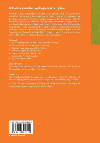 Dieses Buch verschafft dem interessierten Leser an Hochschulen und Universitäten eine ideale Einführung in das anspruchsvolle Gebiet der optimalen Steuerung und Regelung dynamischer Systeme. Darüber hinaus werden dem Studierenden in einem separaten Kapitel die modernen Methoden der adaptiven Regelung technischer Prozesse nahegebracht, die vor allem für künftige Anwendungen von zentraler Bedeutung sind. Im Interesse eines möglichst bequemen Einstiegs in die zweifellos komplexe Materie bietet das Buch einen erschöpfenden Abriss der notwendigen mathematischen Grundlagen sowie zum Verständnis der diversen Kapitel eine Fülle praktisch relevanter Beispiele, untermauert mit den Methoden der aktuellen digitalen Simulationstechnik.