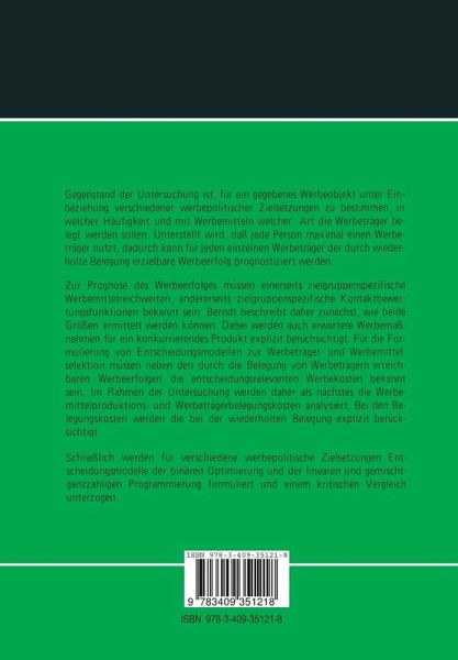 In Anbetracht der Hohe der Werbebudgets und der bedeutsamen Wirkung der Wer bung auf den Absatz wird der Wahl der Werbemittel und der Wahl der Medien, wel che die Werbebotschaft an die Umworbenen herantragen, von Wissenschaft und Praxis gro~e Beachtung geschenkt. Mediaselektion gilt als einer der relativ wenigen Bereiche, in denen die Anwendung quantitativer Methoden der Betriebswirtschafts lehre erfolgreich ist. Der Wille zur direkten praktischen Nutzung hat die theore tische Fundierung und Grundlagenforschung der Mediaselektion jedoch meist zu kurz kommen lassen. 1m Seminar flir Handel und Marktwesen der Universitat Ham burg ist in den letzten Jahren eine Reihe von Planungsansiitzen entwickelt worden, welche Medienliberschneidungen und Zielgruppenliberschneidungen exakt unter Kontrolle bringen, die unter verschiedenen Bedingungskonstellationen bislang nur unbefriedigend oder liberhaupt nicht beriicksichtigt werden konnten. Der Verfasser hat sich mit der vorliegenden Untersuchung das Verdienst erworben, die Losung der Werbemittel- und Werbemedienselektionsprobleme in mehreren wichtigen Richtungen weitergeftihrt zu haben. Die Untersuchung geht aus von einer Analyse der werbepolitischen Zielsetzungen. Unterschieden werden okonomische, psychologische und streutechnische Werbe ziele, deren Beziehungen untereinander analysiert werden. Entgegen mancher Ansicht in der Literatur zur Mediaselektion wird als okonomisches Werbeziel auch die Gewinnmaximierung mit einbezogen. Der gro~te Teil der Arbeit ist dem besonderen Anliegen des Verfassers gewidmet, den Werbeerfolg zu prognostizieren, der durch wiederholte Belegung eines Werbe triigers bei Verfolgung verschiedener werbepolitischer Zielsetzungen erreichbar ist.