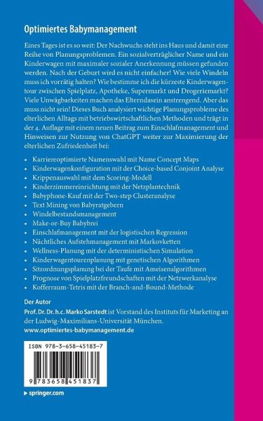 Eines Tages ist es so weit: Der Nachwuchs steht ins Haus und damit eine Reihe von Planungsproblemen. Ein sozialverträglicher Name und ein Kinderwagen mit maximaler sozialer Anerkennung müssen gefunden werden. Nach der Geburt wird es nicht einfacher! Wie viele Windeln muss ich vorrätig halten? Wie bestimme ich die kürzeste Kinderwagentour zwischen Bäckerei, Spielplatz, Apotheke, Supermarkt und Drogeriemarkt? Viele Unwägbarkeiten machen das Elterndasein anstrengend. Aber das muss nicht sein! Dieses Buch schafft Abhilfe. Marko Sarstedt analysiert wichtige Planungsprobleme des elterlichen Alltags mit betriebswirtschaftlichen Methoden und trägt in der 4. Auflage mit einem neuen Beitrag zum Einschlafmanagement und Hinweisen zur Nutzung von ChatGPT weiter zur Maximierung der elterlichen Zufriedenheit bei:
