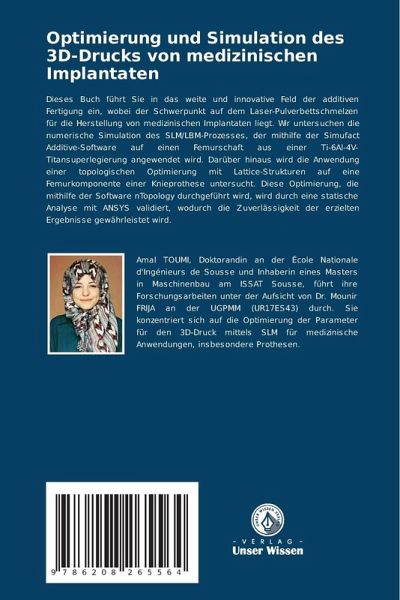 Dieses Buch führt Sie in das weite und innovative Feld der additiven Fertigung ein, wobei der Schwerpunkt auf dem Laser-Pulverbettschmelzen für die Herstellung von medizinischen Implantaten liegt. Wir untersuchen die numerische Simulation des SLM/LBM-Prozesses, der mithilfe der Simufact Additive-Software auf einen Femurschaft aus einer Ti-6Al-4V-Titansuperlegierung angewendet wird. Darüber hinaus wird die Anwendung einer topologischen Optimierung mit Lattice-Strukturen auf eine Femurkomponente einer Knieprothese untersucht. Diese Optimierung, die mithilfe der Software nTopology durchgeführt wird, wird durch eine statische Analyse mit ANSYS validiert, wodurch die Zuverlässigkeit der erzielten Ergebnisse gewährleistet wird.