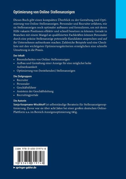 Dieses Buch gibt einen kompakten Überblick zu der Gestaltung und Optimierung von Online-Stellenanzeigen. Personaler und Recruiter erfahren, wie sie Stellenanzeigen noch optimaler aufbauen und formulieren, um mit deren Hilfe vakante Positionen effektiv und schnell besetzen zu können. Gerade in Branchen mit einem Mangel an qualifizierten Fachkräften können Personaler durch eine präzise Stellenanzeige potenzielle Kandidaten ansprechen und auf ihr Unternehmen aufmerksam machen.