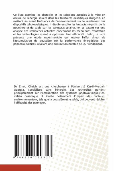 Ce livre examine les obstacles et les solutions associés à la mise en oeuvre de l'énergie solaire dans les territoires désertiques d'Algérie, en mettant en avant l'influence de l'environnement sur le rendement des dispositifs photovoltaïques. Il étudie ensuite les impacts négatifs de la poussière et du sable sur les panneaux solaires, en se basant sur une analyse des recherches actuelles concernant les techniques d'entretien et les technologies visant à optimiser leur efficacité. Enfin, le livre présente une étude expérimentale qui évalue l'effet direct de l'accumulation de poussière sur la performance énergétique des panneaux solaires, révélant une diminution notable de leur rendement.