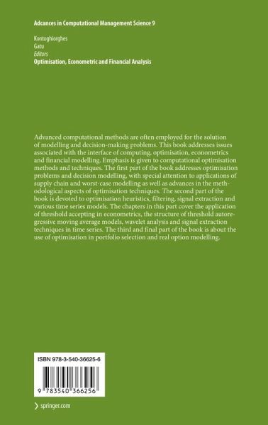 Advanced computational methods are often employed for the solution of modelling and decision-making problems. This book addresses issues associated with the interface of computing, optimisation, econometrics and financial modelling. Emphasis is given to computational optimisation methods and techniques. The first part of the book addresses optimisation problems and decision modelling, with special attention to applications of supply chain and worst-case modelling as well as advances in the methodological aspects of optimisation techniques. The second part of the book is devoted to optimisation heuristics, filtering, signal extraction and various time series models. The chapters in this part cover the application of threshold accepting in econometrics, the structure of threshold autoregressive moving average models, wavelet analysis and signal extraction techniques in time series. The third and final part of the book is about the use of optimisation in portfolio selection and realoption modelling.