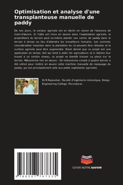 De nos jours, le secteur agricole est en déclin en raison de l'absence de main-d'oeuvre. Si l'idée est mise en oeuvre dans l'exploitation agricole, le propriétaire du terrain peut lui-même planter ses semis de paddy dans le terrain à temps au lieu d'attendre les travailleurs humains. Les sommes considérables investies dans la plantation du riz peuvent être réduites et la surface agricole peut être augmentée. Étant donné que ce projet est une application en temps réel qui tend à aider les agriculteurs et à réduire leur travail à un certain niveau, ce projet va bientôt trouver sa place sur le terrain. Mécanisme mis en oeuvre : Un mécanisme simple à quatre barres a été utilisé pour mettre en oeuvre cette machine manuelle de repiquage du paddy, qui est principalement utile aux petits exploitants agricoles.
