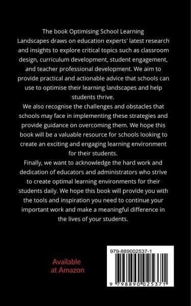 The book Optimising School Learning Landscapes draws on education experts' latest research and insights to explore critical topics such as classroom design, curriculum development, student engagement, and teacher professional development. We aim to provide practical and actionable advice that schools can use to optimise their learning landscapes and help students thrive. Finally, we want to acknowledge the hard work and dedication of educators and administrators who strive to create optimal learning environments for their students daily. We hope this book will provide you with the tools and inspiration you need to continue your important work and make a meaningful difference in the lives of your students. Author