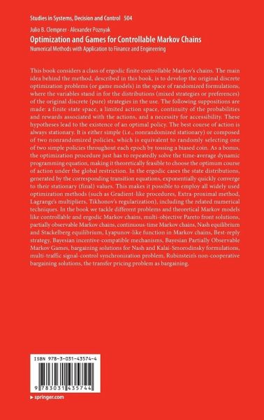 This book considers a class of ergodic finite controllable Markov's chains. The main idea behind the method, described in this book, is to develop the original discrete optimization problems (or game models) in the space of randomized formulations, where the variables stand in for the distributions (mixed strategies or preferences) of the original discrete (pure) strategies in the use. The following suppositions are made: a finite state space, a limited action space, continuity of the probabilities and rewards associated with the actions, and a necessity for accessibility. These hypotheses lead to the existence of an optimal policy. The best course of action is always stationary. It is either simple (i.e., nonrandomized stationary) or composed of two nonrandomized policies, which is equivalent to randomly selecting one of two simple policies throughout each epoch by tossing a biased coin. As a bonus, the optimization procedure just has to repeatedly solve the time-average dynamic programming equation, making it theoretically feasible to choose the optimum course of action under the global restriction. In the ergodic cases the state distributions, generated by the corresponding transition equations, exponentially quickly converge to their stationary (final) values. This makes it possible to employ all widely used optimization methods (such as Gradient-like procedures, Extra-proximal method, Lagrange's multipliers, Tikhonov's regularization), including the related numerical techniques. In the book we tackle different problems and theoretical Markov models like controllable and ergodic Markov chains, multi-objective Pareto front solutions, partially observable Markov chains, continuous-time Markov chains, Nash equilibrium and Stackelberg equilibrium, Lyapunov-like function in Markov chains, Best-reply strategy, Bayesian incentive-compatible mechanisms, Bayesian Partially Observable Markov Games, bargaining solutions for Nash and Kalai-Smorodinsky formulations, multi-traffic signal-control synchronization problem, Rubinstein's non-cooperative bargaining solutions, the transfer pricing problem as bargaining.