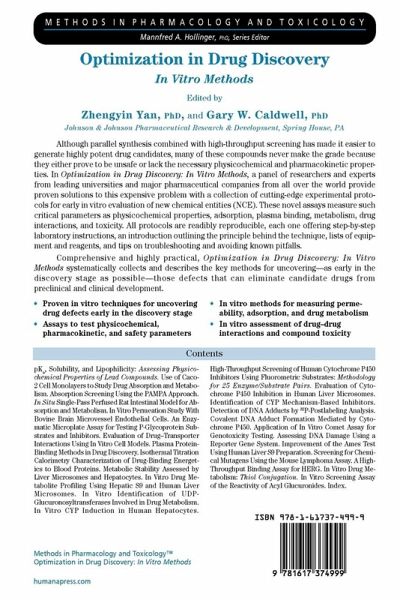 Recent analyses of drug attrition rates reveal that a significant number of drug candidates fail in the later stage of clinical development owing to absorption, distribution, metabolism, elimination (ADME), and toxicity issues. Lead optimization in drug discovery, a process attempting to uncover and correct these defects of drug candidates, is highly beneficial in lowering the cost and time to develop therapeutic drugs by reducing drug candidate failures in development. At present, parallel synthesis combining with high-throughput screening has made it easier to generate highly potent compounds (i. e. , hits). However, to be a potential drug, a hit must have drug-like characteristics in addition to potency, which include optimal physicochemical properties, reasonable ph- macokinetic parameters, and good safety profiles. Therefore, research tools must be available in drug discovery to rapidly screen for compounds with favorable drug-like properties, and thus adequate resources canbe directed to projects with high potential. Optimization in Drug Discovery: In Vitro Methods is a compilation of detailed experimental protocols necessary for setting up a variety of assays important in compound evaluation. A total of 25 chapters, contributed by many experts in their research areas, cover a wide spectrum of subjects including physicochemical properties, abso- tion, plasma binding, metabolism, drug interactions, and toxicity. A good pharmacokinetic profile has long been recognized as an imp- tant drug-like characteristic. Pharmacokinetic parameters are affected by many properties of drug molecules such as physicochemical nature, abso- tion, metabolic stability, and so on.