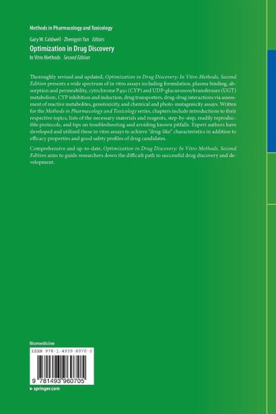 Thoroughly revised and updated, Optimization in Drug Discovery: In Vitro Methods, Second Edition presents a wide spectrum of in vitro assays including formulation, plasma binding, absorption and permeability, cytochrome P450 (CYP) and UDP-glucuronosyltransferases (UGT) metabolism, CYP inhibition and induction, drug transporters, drug-drug interactions via assessment of reactive metabolites, genotoxicity, and chemical and photo-mutagenicity assays. Written for the Methods in Pharmacology and Toxicology series, chapters include introductions to their respective topics, lists of the necessary materials and reagents, step-by-step, readily reproducible protocols, and tips on troubleshooting and avoiding known pitfalls. Expert authors have developed and utilized these in vitro assays to achieve "drug-like" characteristics in addition to efficacy properties and good safety profiles of drug candidates.