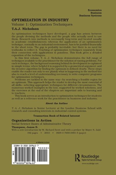 As optimization techniques have developed, a gap has arisen between the people devising the methods and the people who actually need to use them. Research into methods is necessarily long-term and located usually in academic establishments; whereas the application of an optimization technique, normally in an industrial environment, has to be justified financially in the short term. The gap is probably inevitable; but there is no need for textbooks to reflect it. Teaching of optimization techniques separately from their connection with applications is pointless. This book gives a detailed exposition of the techniques. In this first volume, T. A. J. Nicholson demonstrates the full range of techniques available to the practitioner for the solution of varying problems. For each technique, the background reasoning behind its development is explained in simple terms; where helpful it is supported by a geometrical argument; and the iterative algorithm for finding the optimum is defined clearly. These steps enable the reader not only to see plainly what is happening in the method but also to reach a level of understanding necessary to write computer programs for optimization techniques. Problems are tackled in the same way--by searching a feasible region for an optimum. This approach helps the reader to develop the most essential of all skills--selecting appropriate techniques for different circumstances. The numerous worked examples in the text, supported by worked solutions, and the exercises at the end of the chapters are important aids to learning and to teachers. This book serves as an introduction to optimization techniques for students as well as a reference work for the practitioner in business and industry.