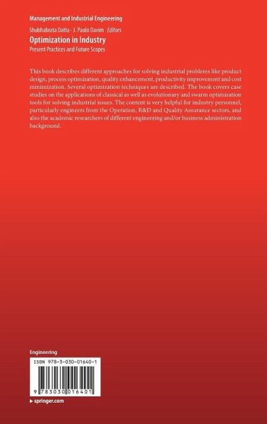 This book describes different approaches for solving industrial problems like product design, process optimization, quality enhancement, productivity improvement and cost minimization. Several optimization techniques are described. The book covers case studies on the applications of classical as well as evolutionary and swarm optimization tools for solving industrial issues. The content is very helpful for industry personnel, particularly engineers from the Operation, R&D and Quality Assurance sectors, and also the academic researchers of different engineering and/or business administration background.