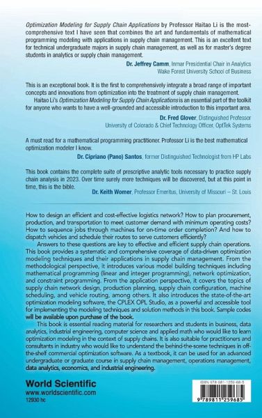 How to design an efficient and cost-effective logistics network? How to plan procurement, production, and transportation to meet customer demand with minimum operating costs? How to sequence jobs through machines for on-time order completion? And how to dispatch vehicles and schedule their routes to serve customers efficiently? Answers to these questions are key to effective and efficient supply chain operations. This book provides a systematic and comprehensive coverage of data-driven optimization modeling techniques and their applications in supply chain management. From the methodological perspective, it introduces various model building techniques including mathematical programming (linear and integer programming), network optimization, and constraint programming. From the application perspective, it covers the topics of supply chain network design, production planning, supply chain configuration, machine scheduling, and vehicle routing, among others. It also introduces the state-of-the-art optimization modeling software, the CPLEX OPL Studio, as a powerful and accessible tool for implementing the modeling techniques and solution methods in this book. Sample codes will be available upon purchase of the book. This book is essential reading material for researchers and students in business, data analytics, industrial engineering, computer science and applied math who would like to learn optimization modeling in the context of supply chains. It is also suitable for practitioners and consultants in industry who would like to understand the behind-the-scene techniques in off-the-shelf commercial optimization software. As a textbook, it can be used for an advanced undergraduate or graduate course in supply chain management, operations management, data analytics, economics, and industrial engineering.